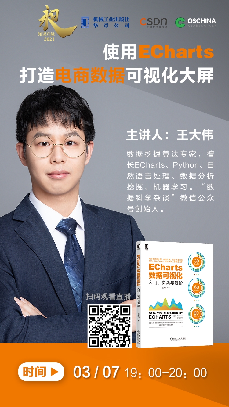 近些年,大屏数据可视化十分流行,在各行业广泛应用。3月7日19点-20点,王大伟将做客华章直播间,带大家从零开始用ECharts搭建一个电商行业的数据可视化大屏,该方法可复用到其他行业。欢迎扫码观看直播。