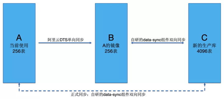 - 配置DTS从A单项同步到B(dts支持同构不需要rehash的数据同步),B做为旧库的验证库,C库做为新库