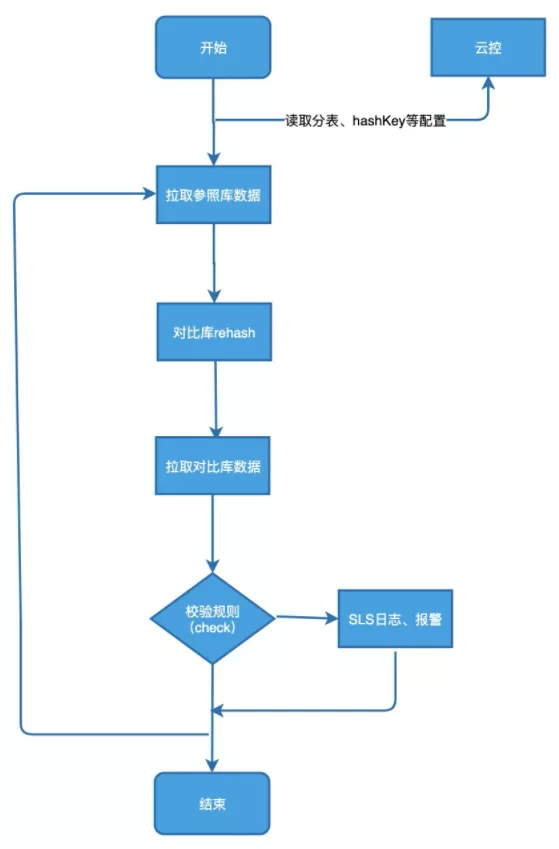 数据校验模块由数据校验服务data-check模块来实现,主要是基于数据库层面的数据对比,逐条核对每一个数据字段是否一致,不一致的话会经过配置的校验规则来进行重试或者报警。