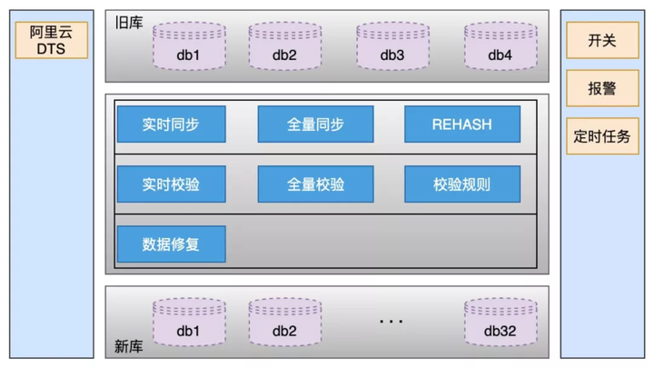 整个数据迁移工作包括:前期准备、数据同步环节(历史数据全量同步、增量数据实时同步、rehash)、数据校验环节(全量校验、实时校验、校验规则配置)、数据修复工具等。