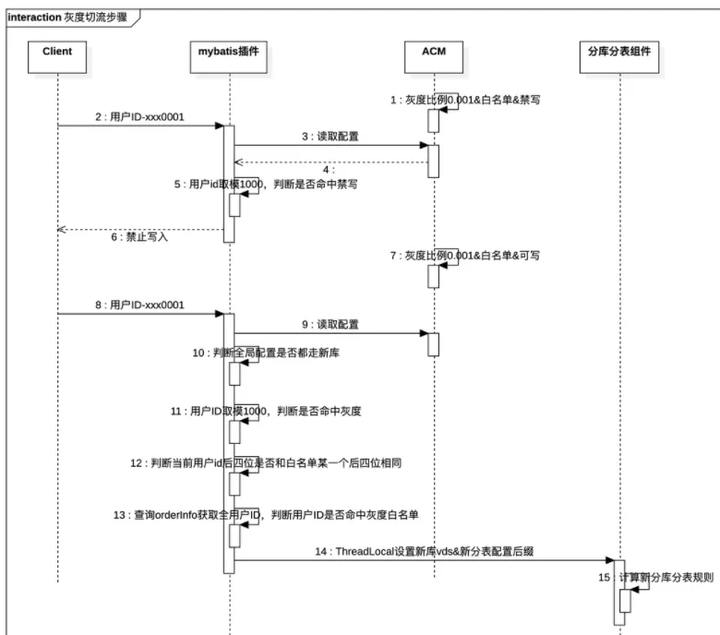 - 代码拦截mybatis请求,根据用户id后四位取模,和ACM设置中设置的灰度比例比较,将新库标识通过ThreadLocal传递到分库分表组件。