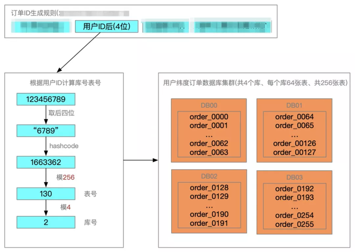要说rehash,就不得不先介绍下当前订单数据的分库分表策略,订单ID中冗余了用户ID的后四位,通过用户ID后四位做hash计算确定库号和表号。