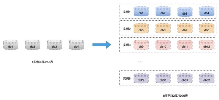 32个库,每个库128张表。未来可最大扩容到32个实例,无需rehash,只需要迁移数据。