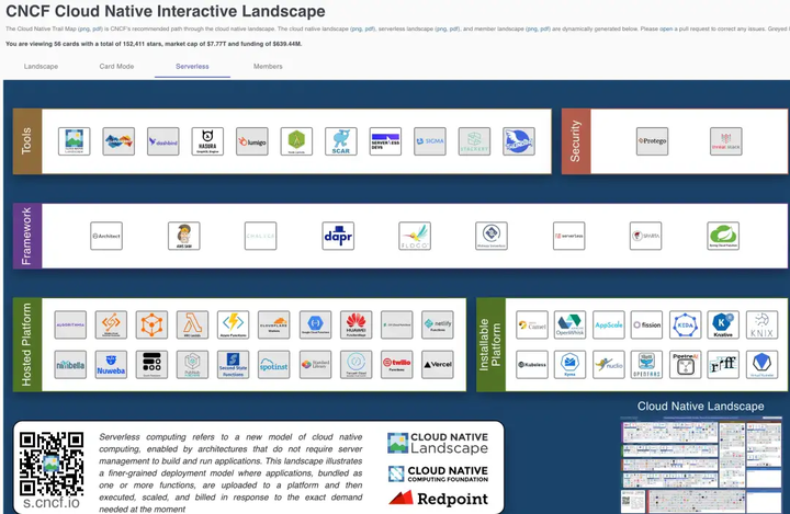 从 CNCF Cloud Native Interactive Landscape 中,我们可以发现,做基建(托管平台)的企业有不少,我们了解的阿里云、腾讯、华为、Amazon 等都在其中,而 Framework 以及更上层的业务工具场景其实不算很多,抛开 aws 的几个工具,只有 Python、JavaScript 和 Java 的工具,比较出名的 Serverless Framework 加上 Spring Cloud Fucntion,基本上能涵盖全球的很大一部分场景。