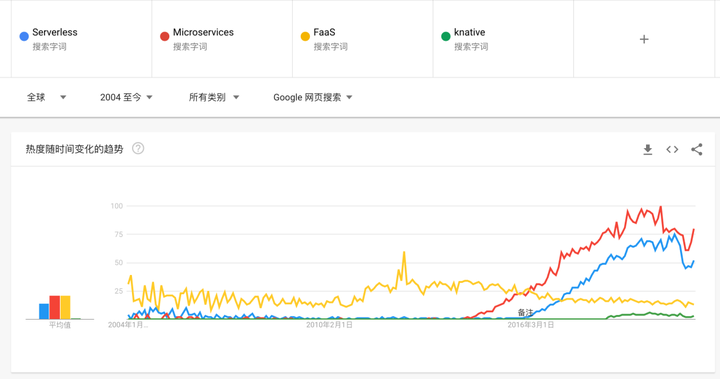 从全球来看,Serverless 整体的趋势还算不错,特别是国内腾讯阿里的推动,热潮不断。对比其他的关键字,我们发现 Serverless 和微服务都在持续增长中,总体说,轻量化、分布式、可维护是一个趋势,这符合当下的编码习惯。