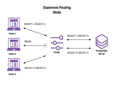 在此,服务器连接分配仅在单个语句的持续时间内持续。这具有与事务池模式相同的会话状态限制,同时还破坏了事务语义。