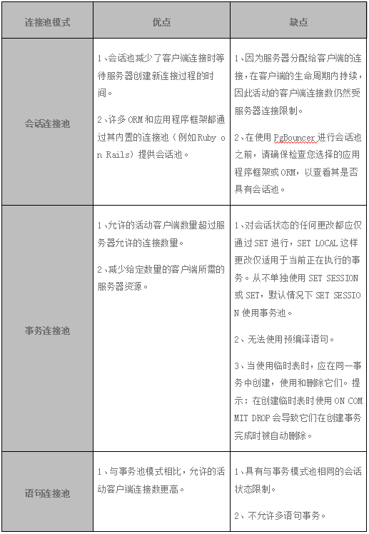 PgBouncer具有三种可用的池模式:事务池,会话池和语句池:
