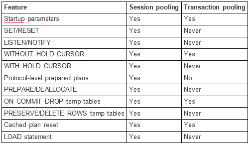 有关使用事务池时不支持的会话状态功能和操作的完整列表,请参见PgBouncer的列表
