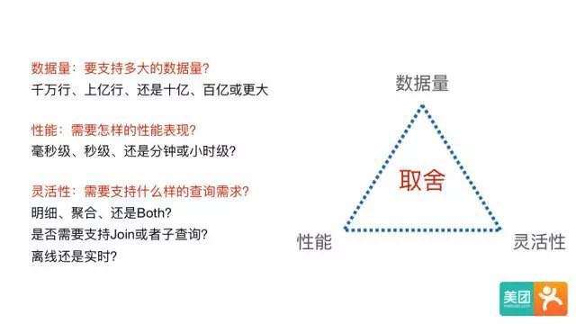 在调研了市面上主流的开源OLAP引擎后发现,目前还没有一个系统能够满足各种场景的查询需求。其本质原因是,没有一个系统能同时在数据量、性能、和灵活性三个方面做到完美,每个系统在设计时都需要在这三者间做出取舍。