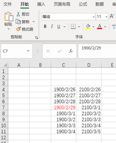 那么1900年并不满足上述条件不是闰年,但是在Excel中却存在1900年2月29日这天,通过拖拽填充的方式,可以看到2月28日之后是29日。是因为Excel还在使用4年一润的儒略历吗?经过测试在Excel中并不存在2100年2月29日,那为什么只有1900年这一天错了?