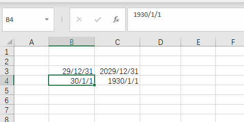 在这里Excel有一个2029规则,记输入00-29中的数字会自动识别为21世纪,其余则是20世纪,如果想输入29年之后的年份,就需要输入四位数字了。当然也可以通过修改操作系统设置来改变2029这个节点,具体可参考Excel的官方说明: https://docs.microsoft.com/zh-cn/office/troubleshoot/excel/two-digit-year-numbers 。
