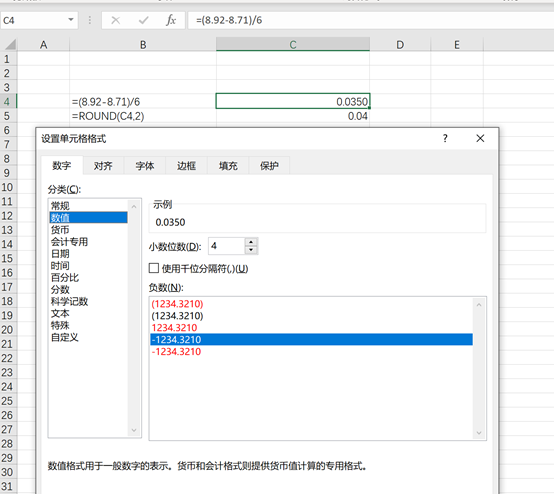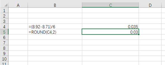 在上述例子中使用的ROUND函数规则是四舍五入,但是同样因为精度问题造成了一些计算问题 。例如=ROUND((8.92-8.71)/6,2) ,结果是0.03。期待值是0.4,由于误差计算结果并未达到0.35,并没有五入。