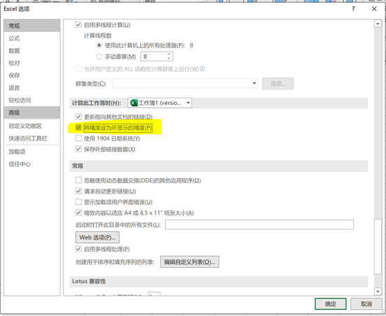 - 在 "计算此工作簿时" 部分,选择所需的工作簿,然后选中 " 将精度设定为显示" 复选框。