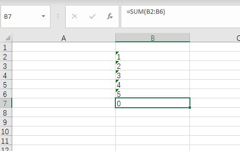 如截图,单元格中对SUM结果为0,同时单元格左上角有绿色三角提示“以文本形式存储的数字“。这个提示就是SUM结果为0的原因,这些数字实际存储格式为文本,而文本并不参加数字的运算。
