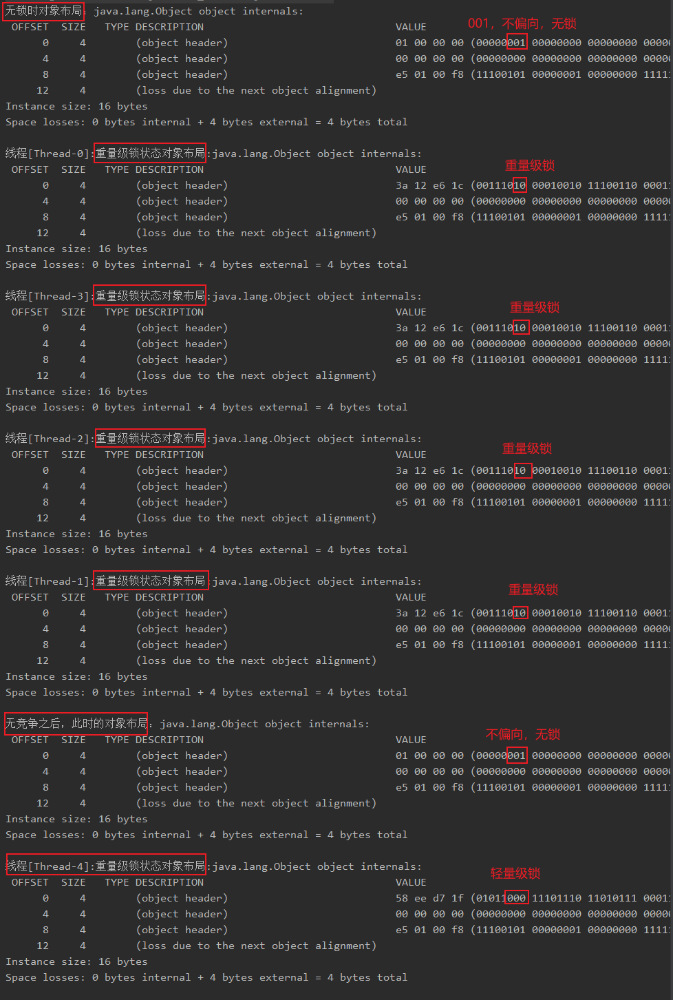代码非常简单,先看下无锁的对象布局,然后多线程争抢此时应该是重量级锁,然后 sleep 等待所有线程执行完毕释放锁,然后再看看此时的锁布局。