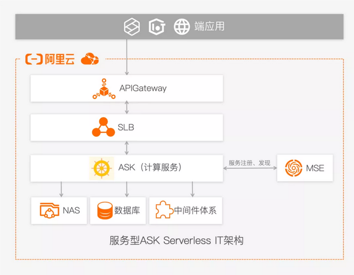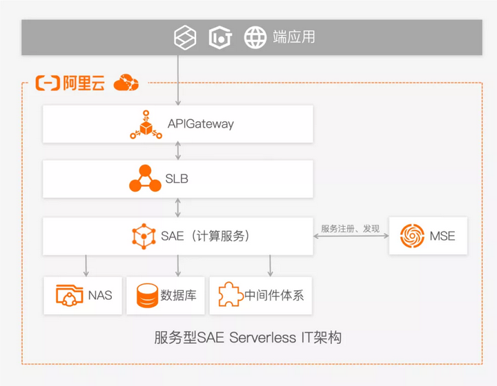 针对有状态或者微服务应用云开发平台提供了服务型SAE架构,可解决应用启动有状态的问题(通过SLB与docker镜像),并可兼容Spring Cloud、Dubbo、HSF等主流的微服务开发框架,完成服务注册、发现、调用与统计。