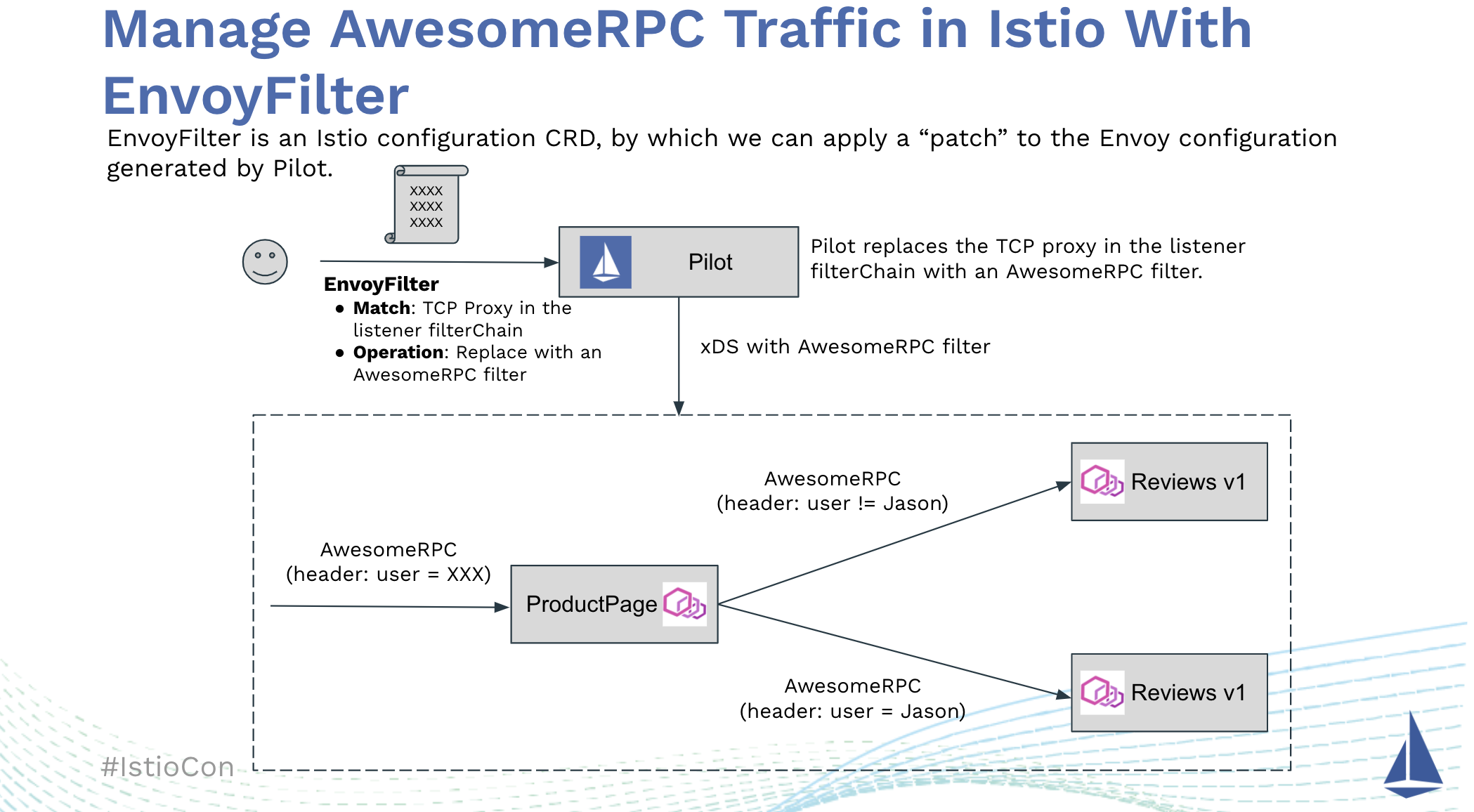 如下图所示,由于 Pilot 并不理解 AwesomeRPC 协议,对于 Pilot 来说, AwesomeRPC 服务只是一个 TCP 服务。在 Pilot 生成的缺省配置中,AwesomeRPC 服务对应的 Outbound Listener 的 FilterChain 中采用了一个 TCP Proxy 来处理其流量。我们在 EnvoyFilter 的 Match 部分中选中该 TCP Proxy,并在 Operation 部分将其替换为一个配置了 Traffic Splitting 规则的 AwesomeRPC Filter。Pilot 会根据 EnvoyFilter 修改其生成的缺省 Envoy 配置,然后下发到数据面的 Envoy 上。这样我们就通过 EnvoyFilter 在 Istio 中实现了对 AwesomeRPC 协议的支持。