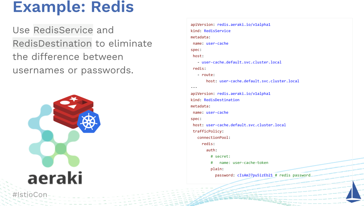 在采用 Aeraki 之前,我们在不同的环境中需要配置不同的 IP 地址和 Redis 访问密码。采用 Aeraki 之后,在客户端可以采用相同的代码和配置,通过修改 Aeraki CRD 来切换不同环境中的 Redis 配置,大大减少在不同环境之间进行切换的成本。即使 Redis 从单实例改为了 Redis 集群,客户端也可以采用相同的方式进行访问。