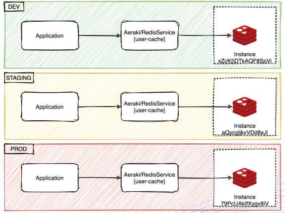 我们在开发、测试和生产环境中通常需要访问不同的后端资源,例如需要连接到不同的 Redis 缓存或者不同的 mySQL 数据库。一般来说,我们需要修改随应用程序发布的配置文件中的后端资源地址,以达到在不同环境中切换后端资源的目的。通过 Aeraki 的帮助,我们可以用 Service Mesh 来屏蔽不同后端资源的配置差异,使得应用程序可以用相同的方式访问不同环境中的后端资源。