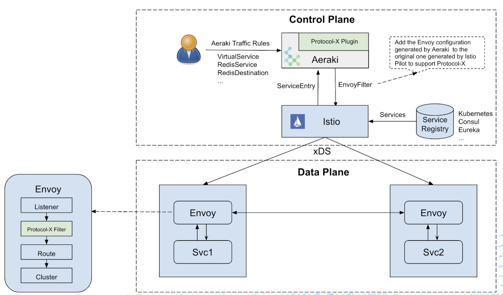 由于难以手动对 EnvoyFilter 进行管理和维护 ,我们创建了Aeraki (发音:[Air-rah-ki])项目来自动化这个流程。Aeraki 是希腊语中“微风”的意思,我们希望 Aeraki 这股微风能帮助 Istio 在云原生的旅程中航行得更远。