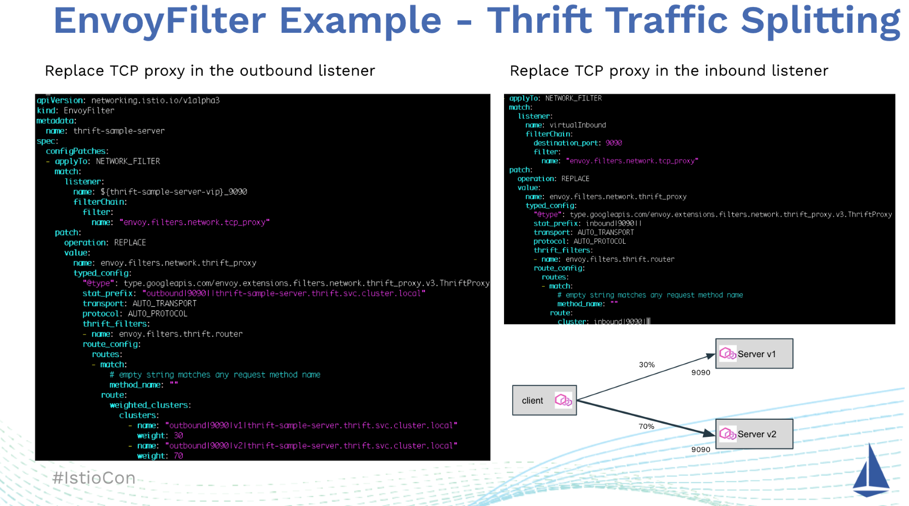 首先,我们需要创建一个图中左边所示的 EnvoyFilter 来处理客户端的出向流量,该 EnvoyFilter 的 Match 条件选中了 $(thrift-sample-server-vip)_9090 这个 Outbound Listener 中 的 tcp_proxy,在 Patch 部分将其替换为一个 thrift_proxy。在该 thrift_proxy 中,我们按照 Traffic Splitting 的要求为其配置了相应的路由:将 30% 的流量路由到 Server v1版本,70% 的流量路由到 Server v2 版本。我们也需要为 Thrift Server 端创建一个如图右上所示的 EnvoyFilter 来处理服务器端的入向流量。相比客户端的 EnvoyFilter 而言,服务器端的 EnvoyFilter 配置要简单一些,因此我们不需要在服务器端配置任何路由规则,只需要将 tcp_proxy 替换为 thrift_proxy 即可。这个 thrift_proxy 虽然没有路由规则,但提供了大量七层的服务通信和治理能力,包括请求层面的负载均衡、产生请求层面的 Metrics 数据等。