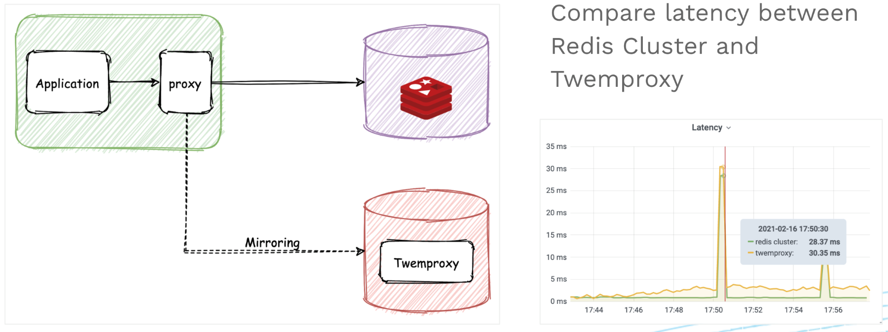 例如下面的场景:我们最初只用了一个单实例 Redis 来做缓存,随着线上业务的不断扩展,该 Redis 实例已经出现了访问瓶颈,我们希望切换为采用 Twemproxy 来对 Redis 进行水平扩展。通过采用 Aeraki 来将线上的 Redis 流量镜像到 Twemproxy 测试环境,我们可以采用真实的业务数据对 Twemproxy 进行充分的测试,以评估其对线上业务的影响。