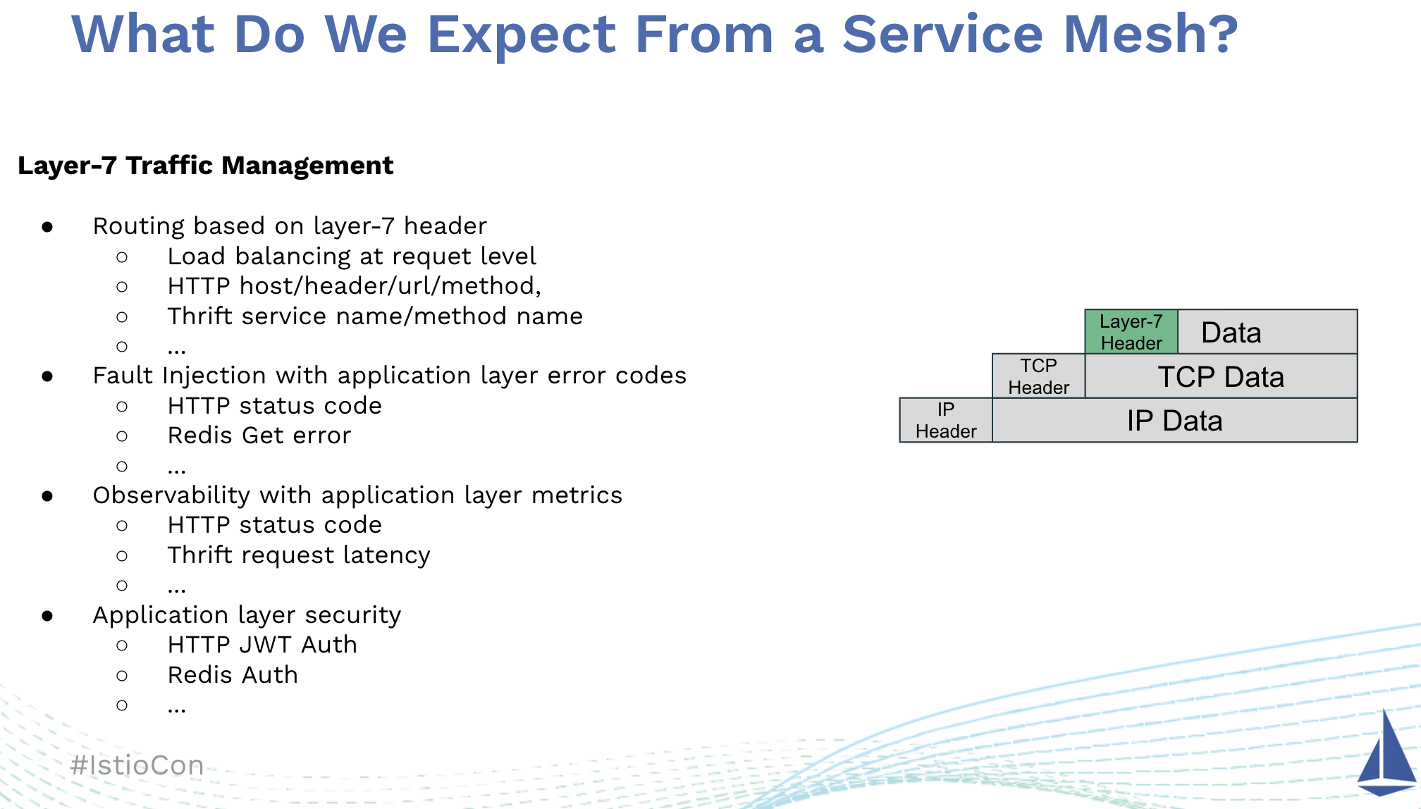 Service Mesh 提供了一个对应用透明的基础设施层,可以解决我们在分布式应用/微服务中遇到的常见挑战,例如:如何找到服务提供者?如何保证服务之间的通信安全?如何得知服务之间的调用关系?如何进行流量管理如灰度发布?等等。Service Mesh 的实现方式是伴随应用部署一个 Sidecar Proxy,该 Sidecar Proxy 会拦截应用的出向和入向流量, 对这些流量进行分析和处理,以达到在不修改应用代码的情况下对服务进行流量管理、安全加密,遥测数据收集的目的。为了实现这些服务治理能力,Sidecar Proxy 不只需要在 OSI 网络模型的三、四层上对流量进行处理,更重要的是需要在七层上进行处理。在七层上,Istio 缺省只支持了 HTTP 和 gPRC 两种协议。但我们在微服务中经常还会使用到的其他七层协议,当将这些微服务应用迁移到 Service Mesh 时,我们希望使用一致的方式对所有的这些七层协议进行统一管理,以充分利用 Service Mesh 基础设施提供的云原生能力。