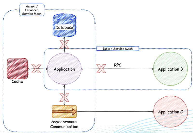 理想情况下,我们希望 Service Mesh 能够管理微服务中用到的所有七层协议的流量,包括 RPC、Messaging、Cache、DB等。例如: