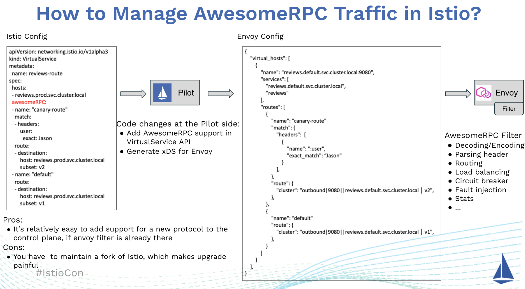 采用这种方式,在 Envoy Filter 已经实现了的情况下,在控制面增加一个新的七层协议的过程是相对比较简单的。但是由于我们修改了 Istio 的源码,因此需要自己维护一个 Istio 的私有分支,这导致了额外的维护代价,并且很难跟上 Istio 快速的迭代步伐。