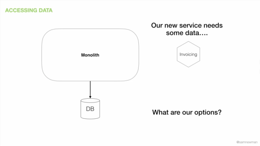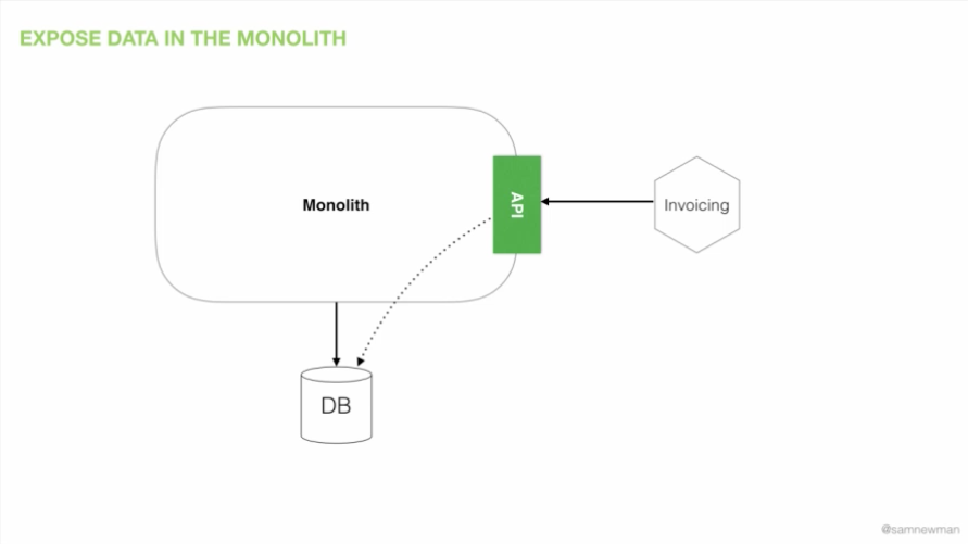 此时,如果我们想要使用别人的数据,那么这可能意味着数据属于单体,我们必须向单体请求数据。我们在单体上创建某种显式的服务接口(在我们的示例中是一个 API),通过它获取我们想要的数据。