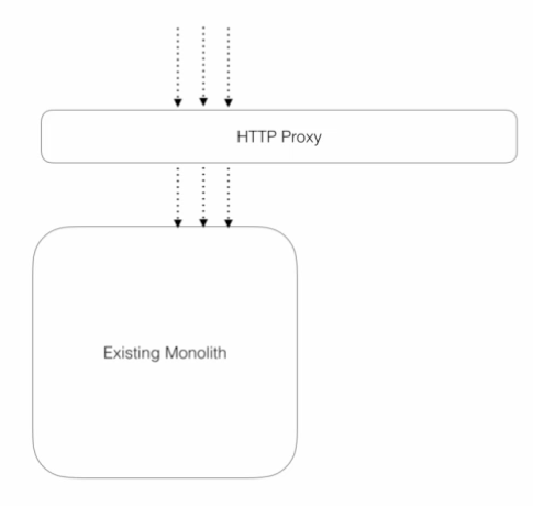 假设我们有一个基于 HTTP 的单体系统。这可能是一个无头应用程序。我们可以在用户界面的后台使用 API Boundary 拦截调用。我们需要的是可以将调用重定向的东西,因此,我们将使用某种 HTTP 代理。对于这类架构,HTTP 协议非常有效,这是因为它非常适合透明地重定向调用。通过 HTTP 发起的调用可以被转接到许多不同的地方。有很多软件可以帮你做到这一点,而且非常简单。