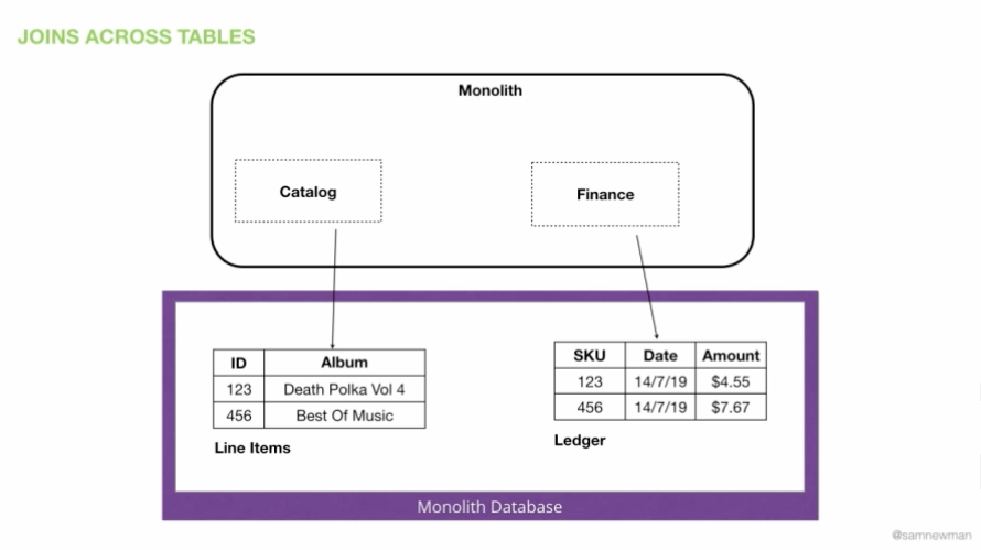 另一种选择是保存服务自己的数据——在本例中,是单体数据库中的结账数据。至此,我们必须把数据移到一个结账数据库,这真的很难。从现有系统(尤其是关系数据库)中提取数据会带来很多麻烦。我们将看一个简单的例子,看看它带来的挑战。我将带大家深入了解一下,如何处理连接。
