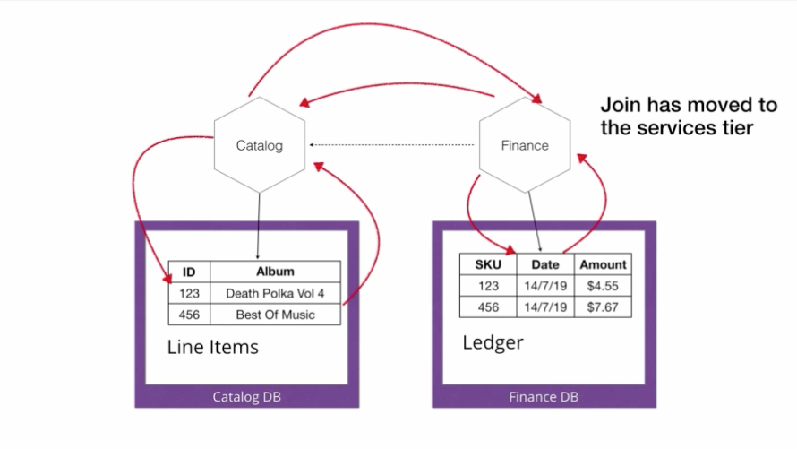 在进入微服务领域后,我们需要在应用层执行连接操作。我们从 Finance 数据库中提取财务交易数据。关于我们出售的物品的信息则存在于 Catalog 数据库中。为了生成销量前 10 名列表,我们必须从 Ledger 表中提取最畅销商品的 ID,然后转到 Catalog 微服务,查询所销售商品的信息。我们过去在关系层中执行的连接操作转移到了应用程序层。