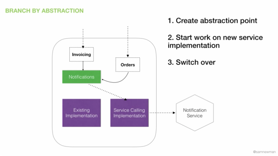 一种名为“抽象分支”的技术可以很好地完成这项工作。在基于主干的开发环境中,抽象分支是一种经常讨论的模式,这是一种很好的软件开发方式。在这种情况下中,抽象分支作为一种模式也很有用。我们在现有的单体系统中创建了一个空间,同一功能的两种实现可以在其中共存。在很多方面,这是里氏替换原则的一个例子。这是对完全相同的抽象做的一个独立实现。对于本例,我们将从现有代码中提取通知功能。