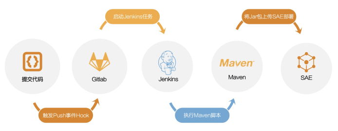目前很多企业的CICD流程都是基于Gitlab和Jenkins来做的,那么SAE也支持将发布的操作集成到这种方案里。这个方案的核心是SAE会提供一个Maven插件,同时对应有三个配置文件,Maven插件通过这三个配置文件中的信息将打包好的Jar/War或者镜像发布到对应的SAE应用中。