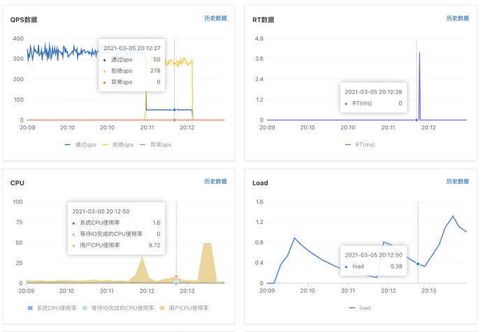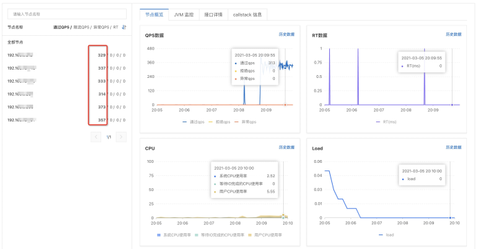 当该接口的QPS达到50后,单个机器超过50的请求将快速失败。比如我们对一个有6个节点的应用进行压测时,可以看到每个节点的QPS情况: