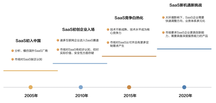 纵观中国企业级SaaS行业发展历程,大体分为四个阶段:2015年之前,中国市场和绝大多数中国企业对“什么是SaaS”缺乏基本认知,基于私有部署的传统软件形式仍为主流,企业级SaaS市场方兴未艾。到了2015年,随着云计算技术的进一步成熟,中国企业级SaaS行业进入快速成长阶段,这个慢赛道逐渐为公众所知。