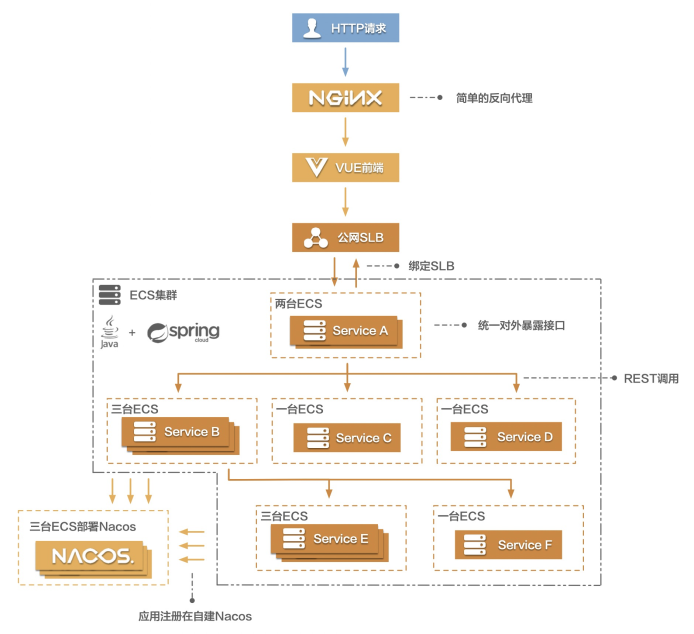 上图展示的是一个较传统的Java+SpringCloud架构应用服务侧的部署架构。除了SLB,基本上所有的组件都部署在ECS上。下面我们来一起看看如何将这个架构转型为云原生架构。