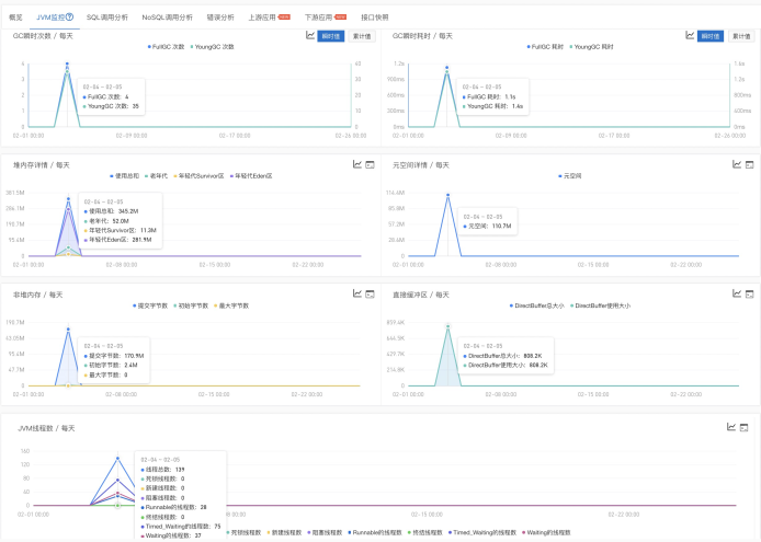应用侧的可观测性分两个维度,一是纵向的Metrics指标,比如主机的CPU、内存、磁盘各项指标,Pod的CPU、内存各项指标,JVM的Full GC、堆内存、非堆内存各项指标。另一个维度是横向的请求调用链路监测,上游服务到下游服务的调用、上游接口到下游接口的调用。