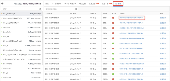 - 在ikf-blog服务中,又有内部接口被调用,因为从调用链上出现了两个ikf-blog,并且这个内部调用是同步调用,而且问题出现在最后一个接口调用上。
