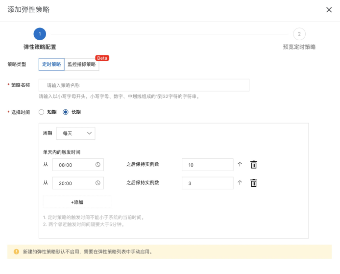 上图是时间策略,即设置好具体的时间节点,在这个时间节点要将应用的实例数扩到几个或者缩到几个。这种策略适合流量高峰期有相对明确时间节点的场景,比如在线教育的客户,通常流量高峰在晚上8点开始,11点逐渐结束,这种情况下,通过定时策略在7点半左右把应用的实例数扩起来,然后11点之后逐渐把应用实例数缩回正常。