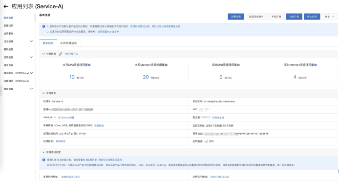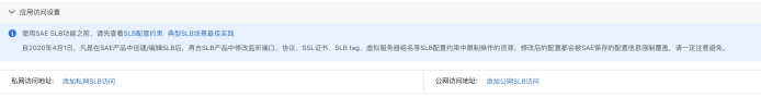 因为ServiceA在架构中是对外提供接口的服务,所以需要对该服务绑定公网SLB暴露IP和做负载均衡,在SAE中,绑定SLB非常简单,在详情页中,即可看到应用访问设置: