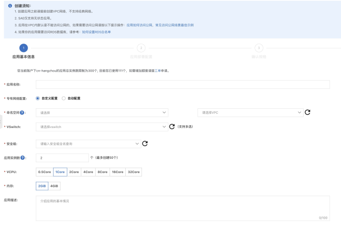 - VCPU/内存:该应用在运行过程中需要的CPU和内存的规格。这里的规格是单个实例数的规格。既如果选择了2C4G,那么有2个实例的话,就是4C8G。