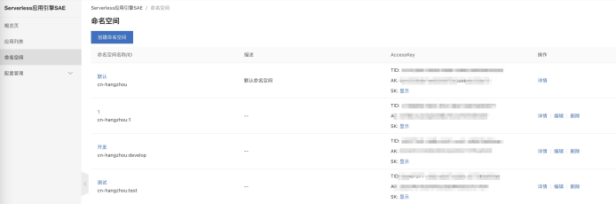 打开SAE控制台,我们首先创建命名空间,SAE的命名空间可以将其下的应用进行网络和资源的逻辑隔离,通常我们可使用命名空间来区分开发环境、测试环境、预发环境、生产环境。