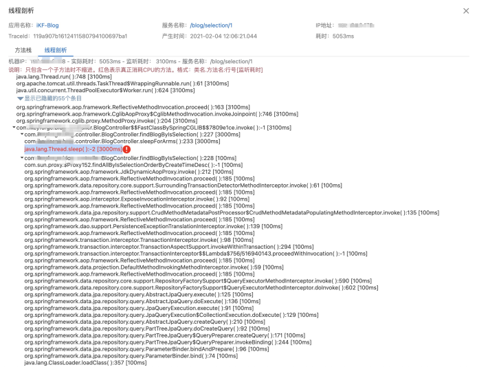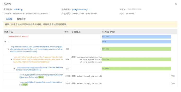 当然除了显性信息外,还有一个比较重要的隐性信息,比如我们可以看到BlogController.findBlogByIsSelection(int isSelection)这个方法的耗时是5s,但是该方法内部的数据库操作的耗时很少,只有1ms,说明耗时是属于业务代码的,毕竟业务代码我们是抓不到也不会去抓取信息的。这时我们可以有两种方式去定位具体问题: