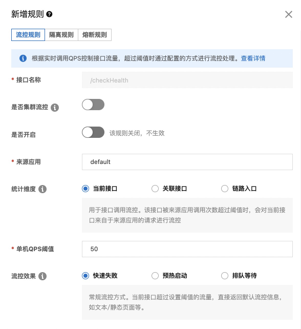 然后我们可以针对每一个接口设置流控、隔离、熔断的规则,比如我对/checkHealth接口设置一条流控规则: