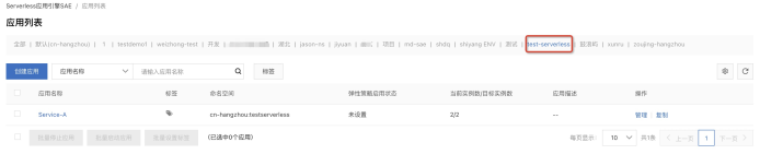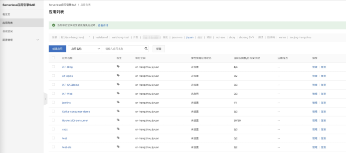 创建好命名空间后,我们进入应用列表,即可选择不同的命名空间,看到其下的应用或者创建应用: