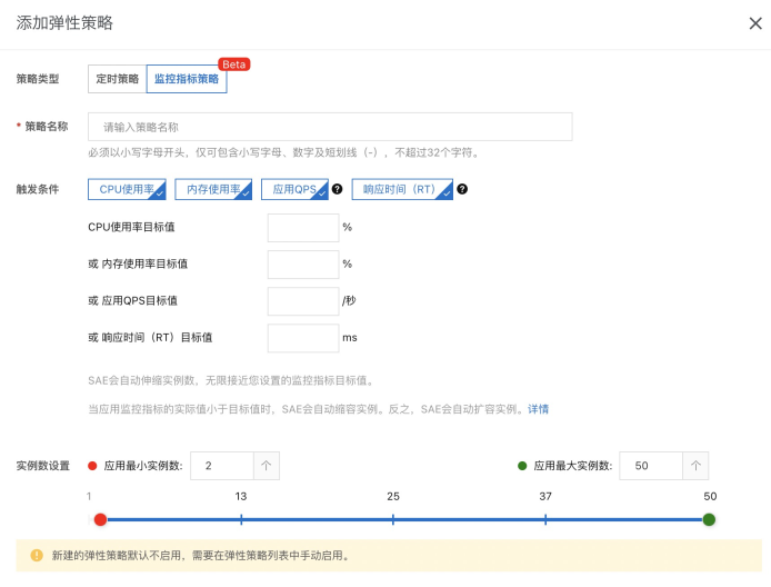 在控制台右上角有自动扩缩操作按钮,然后可以看到创建扩缩规则的界面。SAE自动扩缩提供时间策略和指标策略两种。