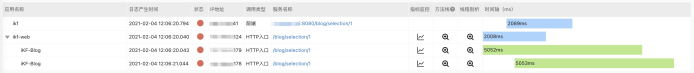 - 上游服务ikf-web的总耗时是2008ms,但下游服务ikf-blog的总耗时是5052ms,而且耗时起点是一样的,说明ikf-web到ikf-blog是一个异步调用。
