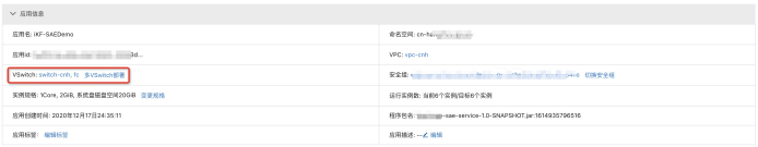 - 自定义配置:用户选择命名空间,VPC,VSwitch以及安全组。一般选择自定义配置,因为咱们的服务所属的VPC肯定要和其他云资源的VPC是相同的,这样才能保证网络畅通。这里需要注意的一点是,当在新的命名空间下第一次创建好应用后,该命名空间就会和所选的VPC进行绑定,之后再创建应用时,该命名空间对应的VPC不可更改。如果需要更改,可以进入命名空间详情进行更改。